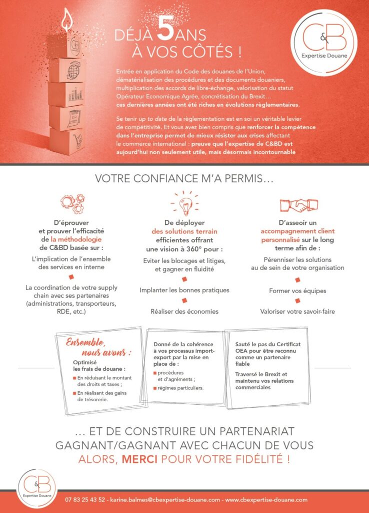 Cette Année, CUSTOMS & BUSINESS DEVELOPMENT fête sa 5ème année, l’occasion pour nous de vous remercier pour votre fidélité !