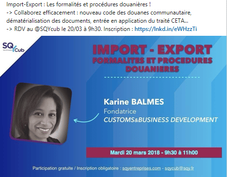 SQYcub / Incubateur « Import / Export : les procédures de dédouanement » le 20/03/2018 à 9h30 Primo-importateurs et primo-exportateurs, cet atelier a pour objectif de vous sensibiliser aux sujets-clés à appréhender pour maîtriser vos échanges avec les pays tiers.